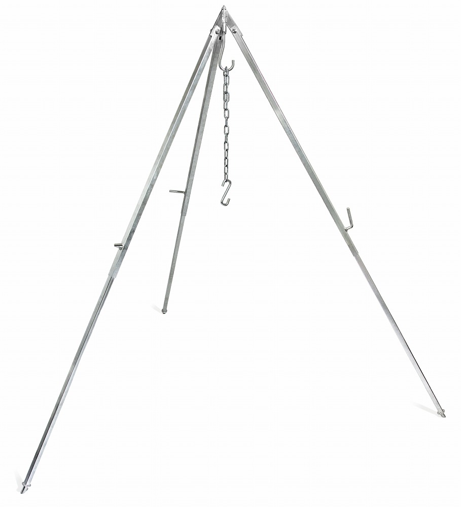 頑丈なスチール製の大型三脚です。不整地でも安定した保持力があり最大40キロまでのダッチオーブンなどを吊り下げることが可能です。