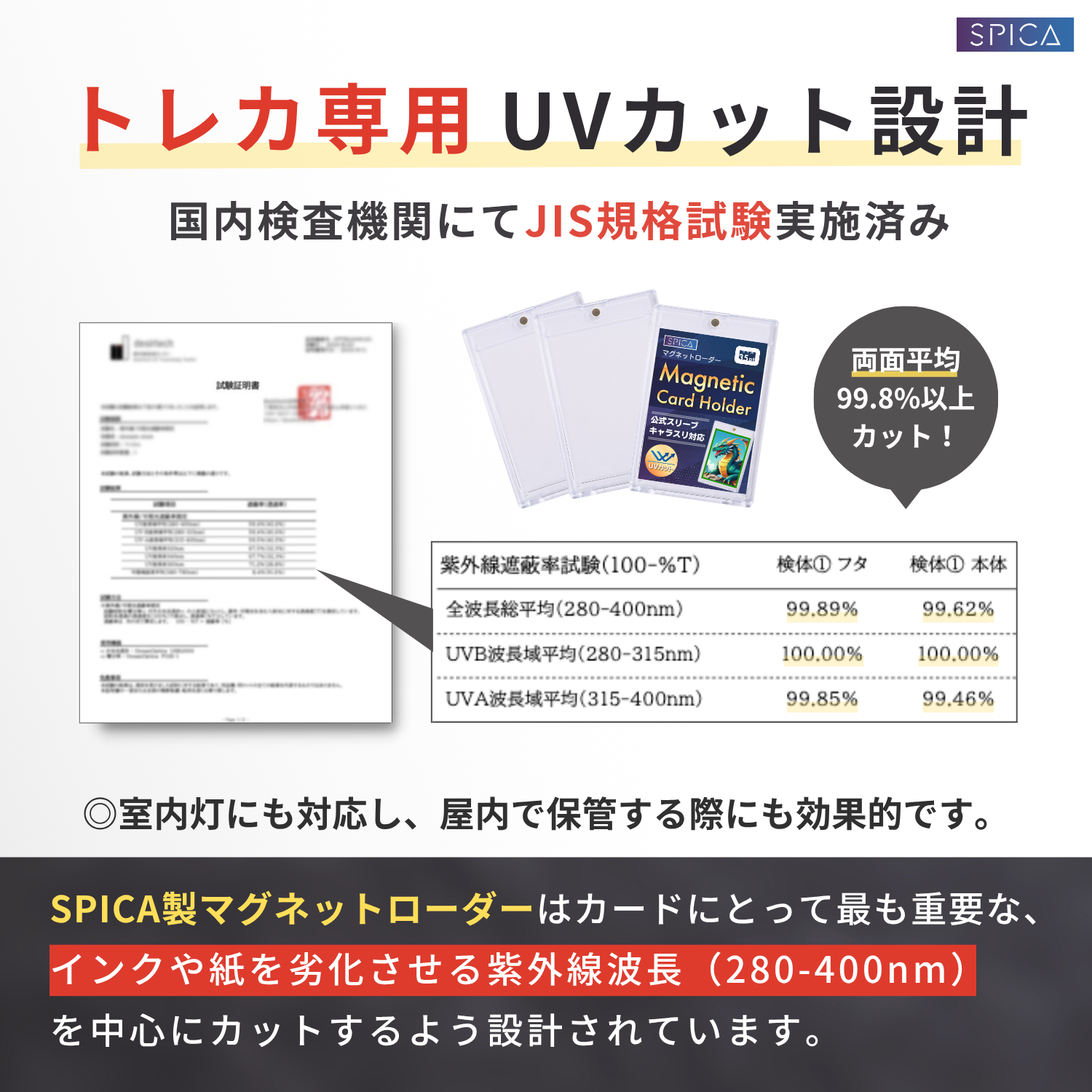 SPICA製マグネットローダーはカードにとって最も重要な、紙やインクを劣化させる紫外線波長(280-400mm)を中心にカットするよう設計。