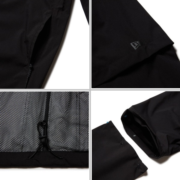 耐水圧10,000mmレベル、透湿度5,000g/m2 /24hrレベル、表面強撥水加工を施した2.5レイヤーラミネート生地を採用したレインウェア。