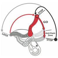 場合、カムが再び作動しロープをロックして、危険な下降速度を防