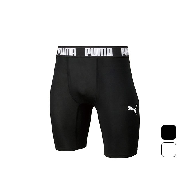 アクティブに活動される方におすすめのコンプレッションショートタイツです。着圧素材となっており伸縮性の高い生地によって着用時の身体に圧をかけることで、身体にさまざまなサポートをもたらしてくれます。様々な動きに柔軟に対応しプレーを妨げません。モックネックにワンポイントのプーマキャットロゴがクールな印象を与え、一枚でもインナーとしてもお使いいただける機能性と実用性に優れたアイテムです。