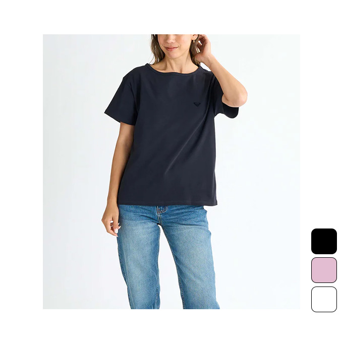 ベア天竺素材の柔らかく心地よいテクスチャーのTシャツです。胸元にワンポイントでロキシーマークをプリントしたシンプルなデザインなので、どんなボトムとも合わせられてデイリーに使いやすい一枚持っていると便利なアイテムです。少し広めのボートネックがポイント。