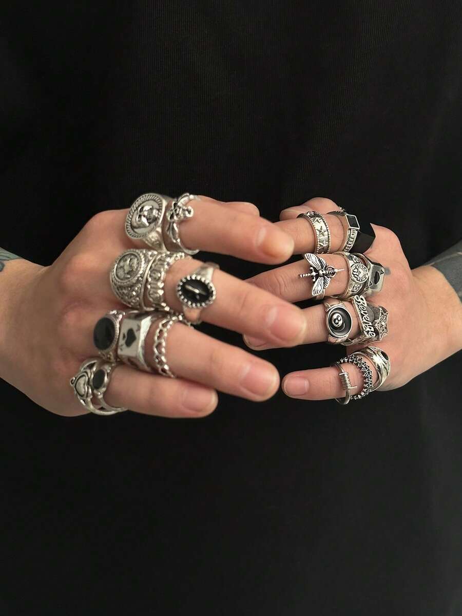 リング メンズ セット 24個セット ゴシック調スカルチャームリング、ファッショナブルなストリートヒップホップジュエリー メンズ用