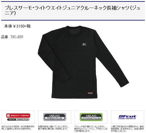 ブレスサーモ・ライトウエイトジュニアクルーネック長袖シャツ(ジュニア) 73CJ201 ミズノ 吸着熱・抗菌防臭・ストレッチ性・動的機能裁断 現品限り