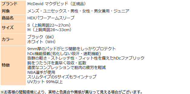 マクダビッド ひじ サポーター HEXパワーアームスリーブ 男女兼用 パッド有り 1個入り(片うで用) M6500×1 ストレッチ UVカット ゆうパケット対応