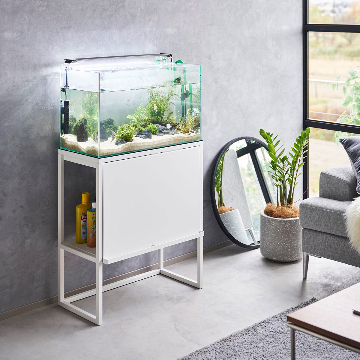 散らかりがちな飼育備品を隠して60cmサイズの大型水槽をディスプレイできるラックです。下にはフィルターやエサなどをまとめて収納できます。扉がついていて目隠しできるので生活感を感じさせません。