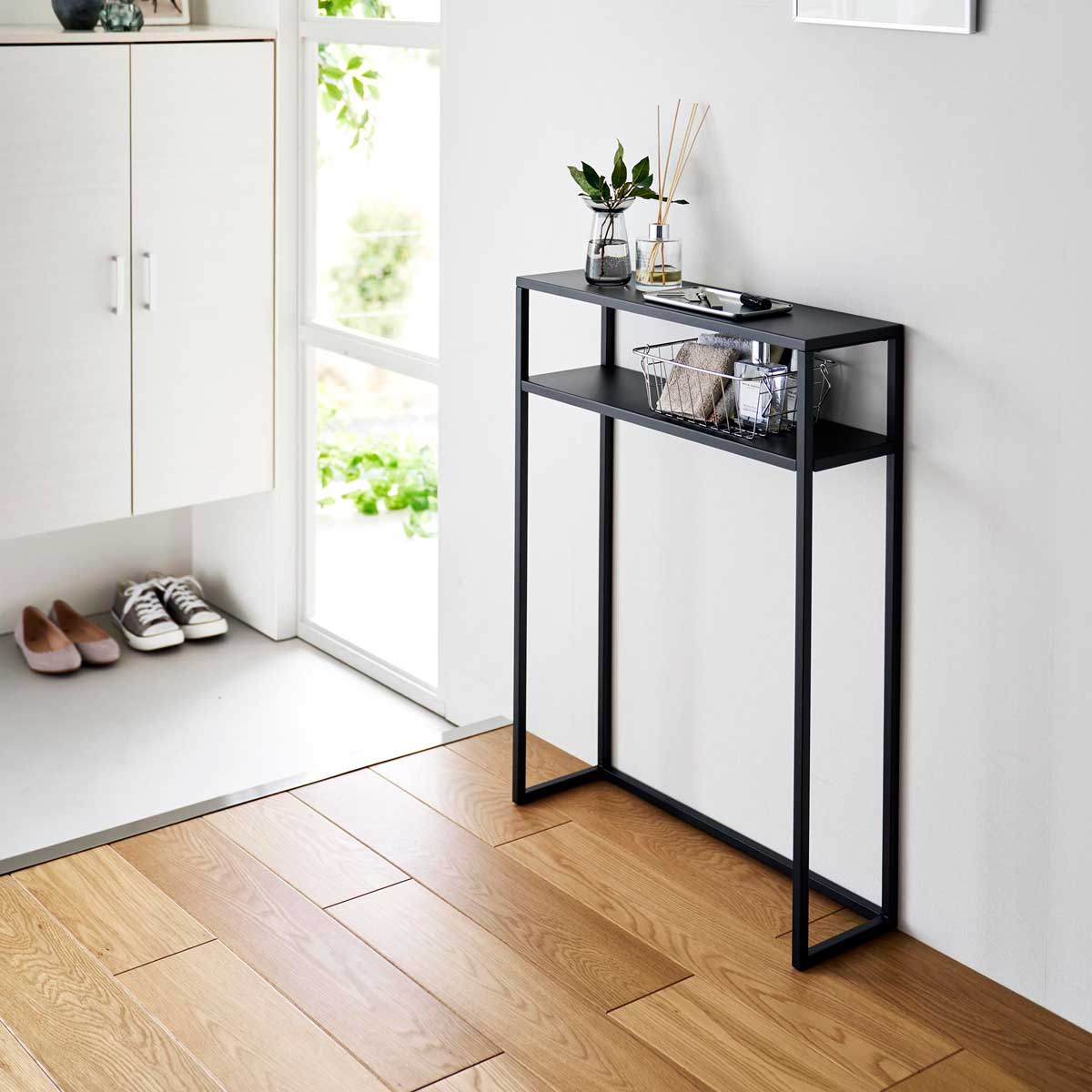 エントランスや廊下、リビングで活躍する棚付きのコンソールテーブルです。眼鏡や鍵などのちょい置きや観葉植物やディフューザーなどディスプレイに便利に使えます。一時置きにも便利なコンソールテーブルです。スチール製の本体にマグネットフックを貼り付けて、エコバッグやペットグッズなどの引っ掛け収納も可能です。