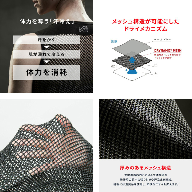 疎水性に優れ、熱伝導率の低いポリプロピレンをベースに、かさ高メッシュで編み上げることで肌面の汗を素早く吸収し、上位のベースレイヤーに拡散します。