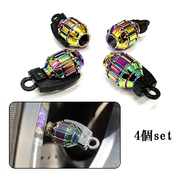 タイヤ エアーバルブキャップ エア バルブ キャップ 4個セット 車 カー バイク 色レインボー 手榴弾型 送料無料
