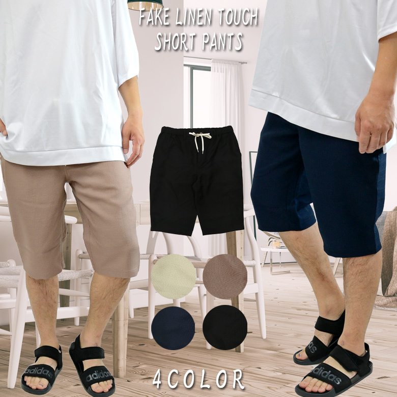 【閉店セール】ショートパンツ フェイクリネン メンズ ハーフパンツ ショーツ 無地 イージーパンツ ベージュ ブラック ピンク ネイビー M L LL
