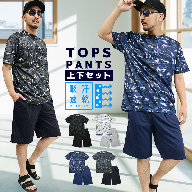 【閉店セール】上下セット 速乾 総柄メッシュ Tシャツ & ショートパンツ 2着セット メンズ SET UP 上下セット セットアップ 通気性 スポーツ 部屋着