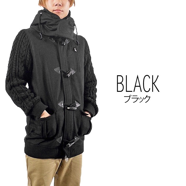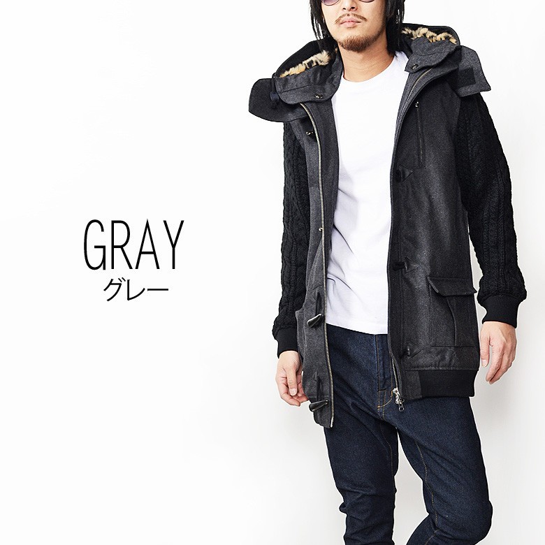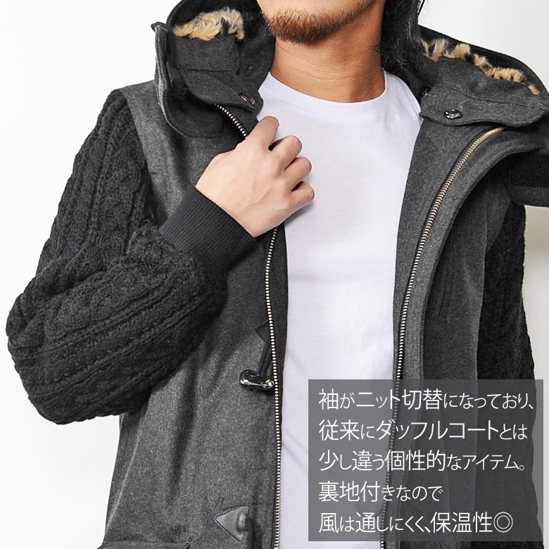 【閉店セール】ダッフルコート メルトン 袖 ニット 切替 デザイン ダッフルコート ブラック チャコール メルトン ウール 冬物 メンズ コート ダッフル