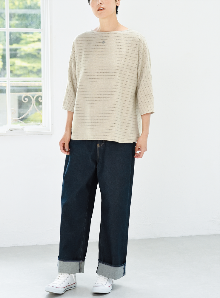 ストライプの布をよこ地に使ったドルマンスリーブのブラウス。布幅を気にしなくていいので、長袖へのアレンジもOK。素材は暖かみのあるコットンツイードです。長袖のハイネックプルオーバーなどに重ねて着てもおしゃれ。