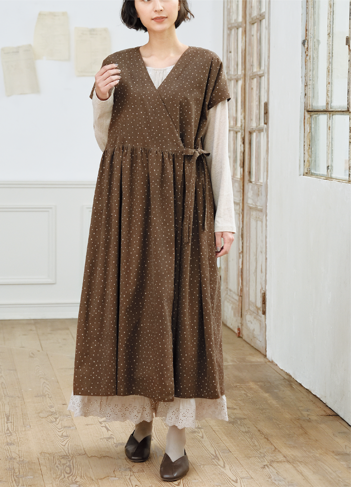 カシュクール型で袖なしタイプ。細コールのドットプリントがかわいらしい印象を与えます。裾からガーリーなスカートを覗かせると、よりキュートな雰囲気。