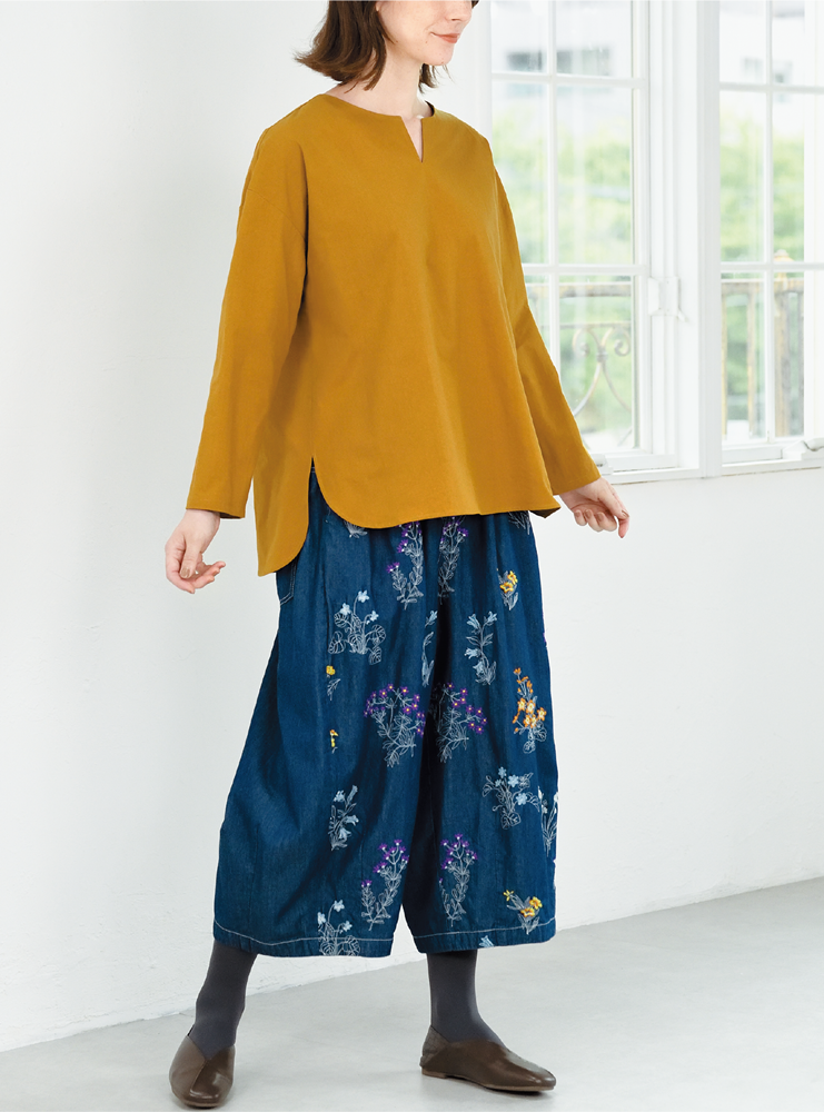 鮮やかな色が着こなしのポイントになるスラッシュあきのブラウス。風を通さず保湿性の高い馬布を使用しました。後ろの着丈が長いので、体型カバーにも。