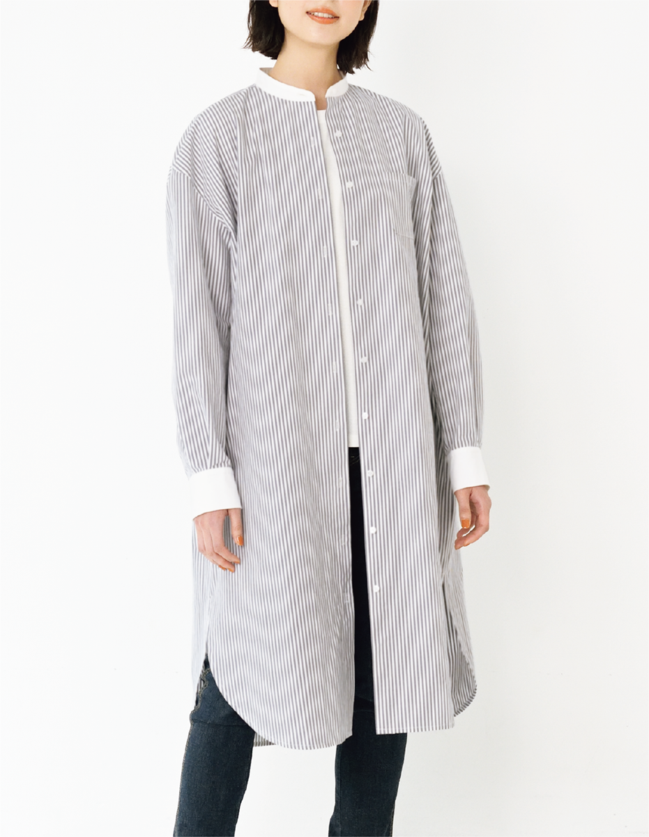 ひざ丈のシャツは、女性らしさを強調する上品なシルエットであり、また、ボタンを絞ってワンピ風に着こなすことができるようになるため、着回しの効くデザインになっています。