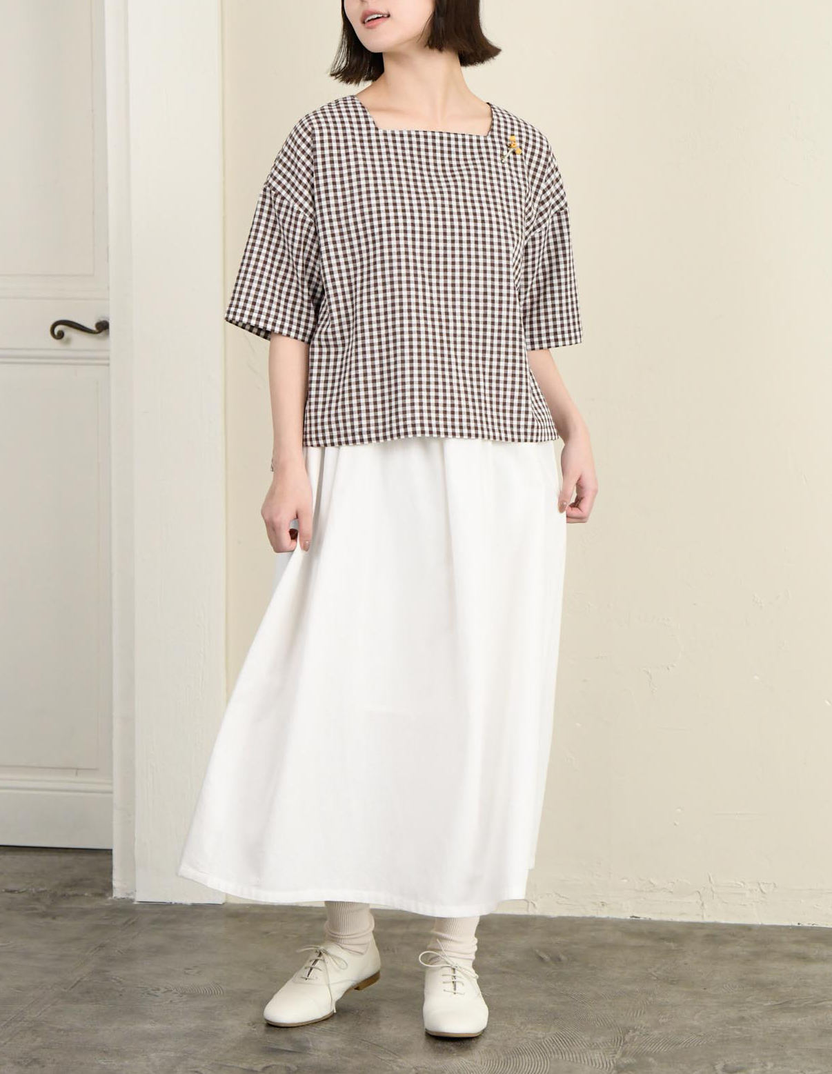 このブラウスは、コットンレースや麻などの軽やかな素材と相性抜群です。風通しの良さと上質な肌触りが特徴で、暑い季節には快適な着心地を提供します。また、シンプルなデザインゆえに、どんなボトムとも相性がよく、コーディネートの幅も広がります。
