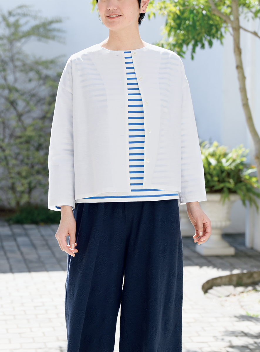 ノーカラーのデザインはシンプルで飽きのこないベーシックなアイテム。日常のカジュアルなスタイリングからオフィスカジュアルまで幅広いシーンで活躍します。このジャケットはコーディネートの幅が広がる上に、一枚でコーディネートが完成する便利さも備えています。