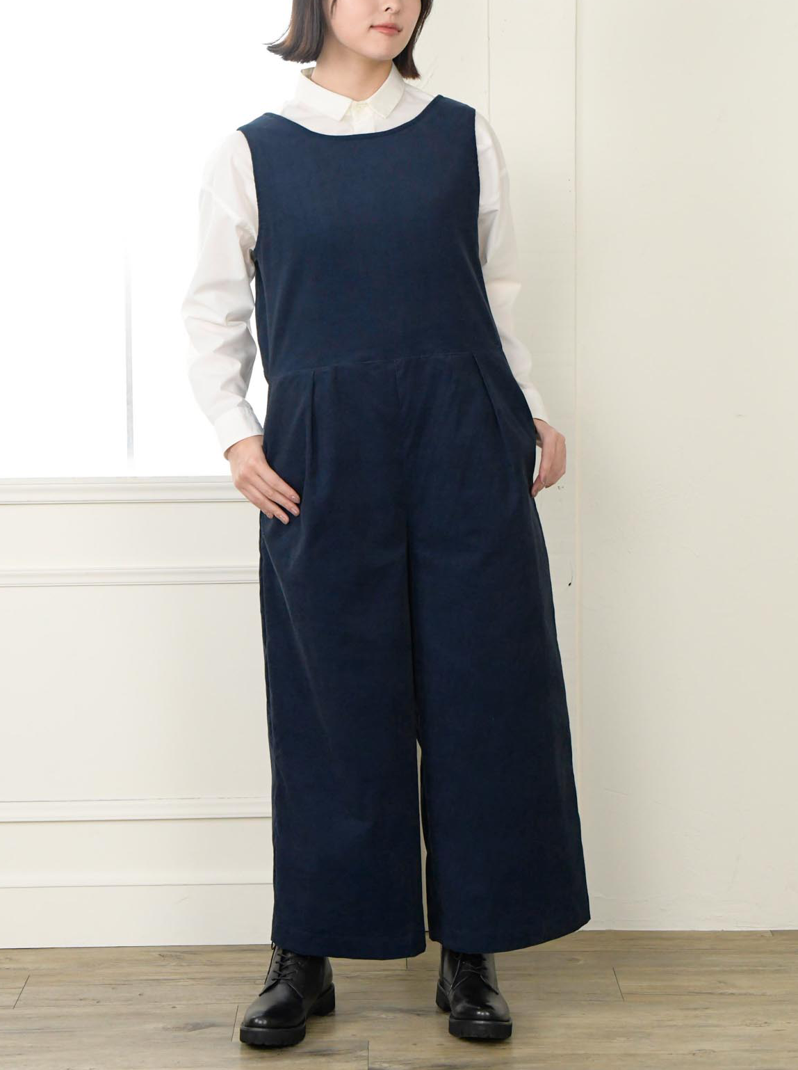 このサロペットは、カジュアルになりすぎずに品良く着こなせる細コール素材で作られています。さらに、後ろは二枚が重なったデザインなので、前とは違った印象が楽しめます。