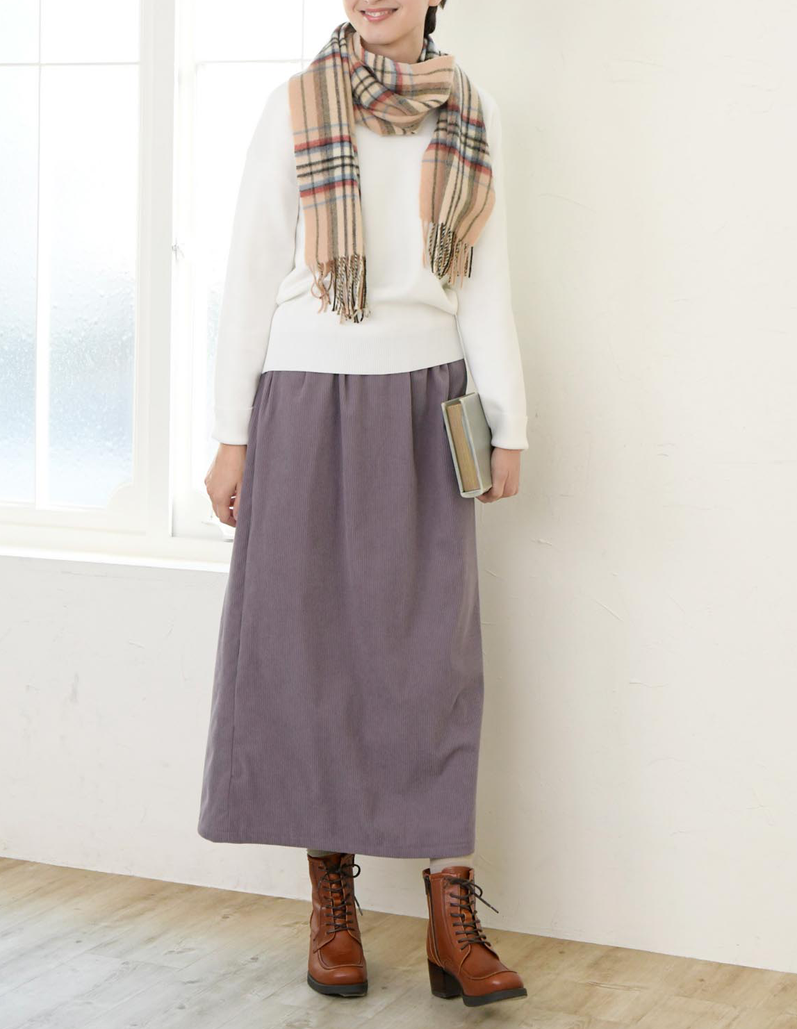 程よくストレッチの効いた、暖かなコーデュロイを使用したタイトスカートです。長めの丈が特徴でありながら、後ろ中心にスリットを入れているため、足さばきもばっちり。ウエストはゴムベルト仕様で、締め付け感はなく、快適な着用感が味わえます。