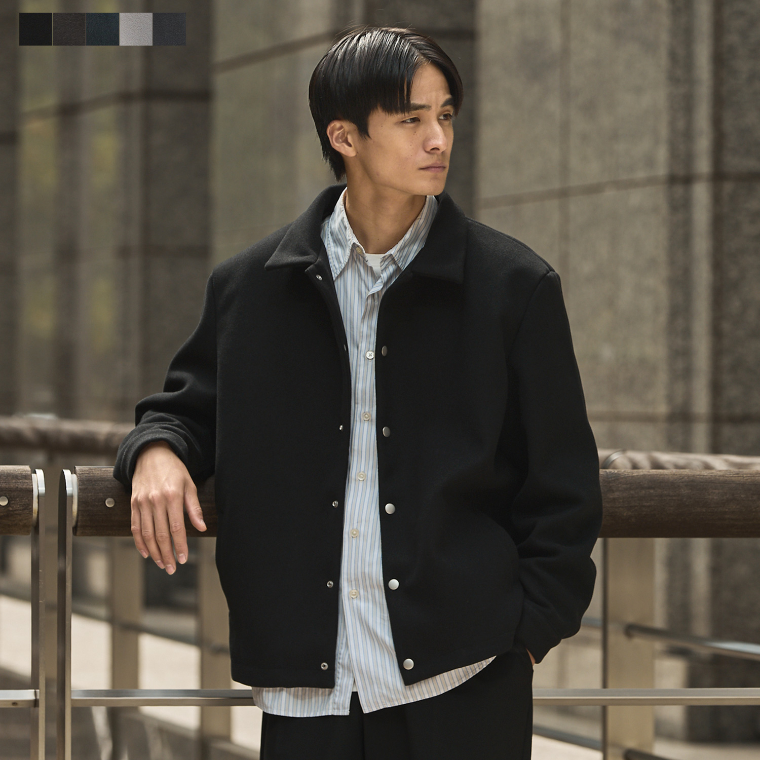 カジュアルテイストのコーチジャケットデザインに品の良い印象を与えるメルトン生地を掛け合わせることで、キレイめにも着回すことができるアウターに仕上げました。中にパーカーやニットのアイテムも着込めるようにシルエットはルーズめに設計しております。