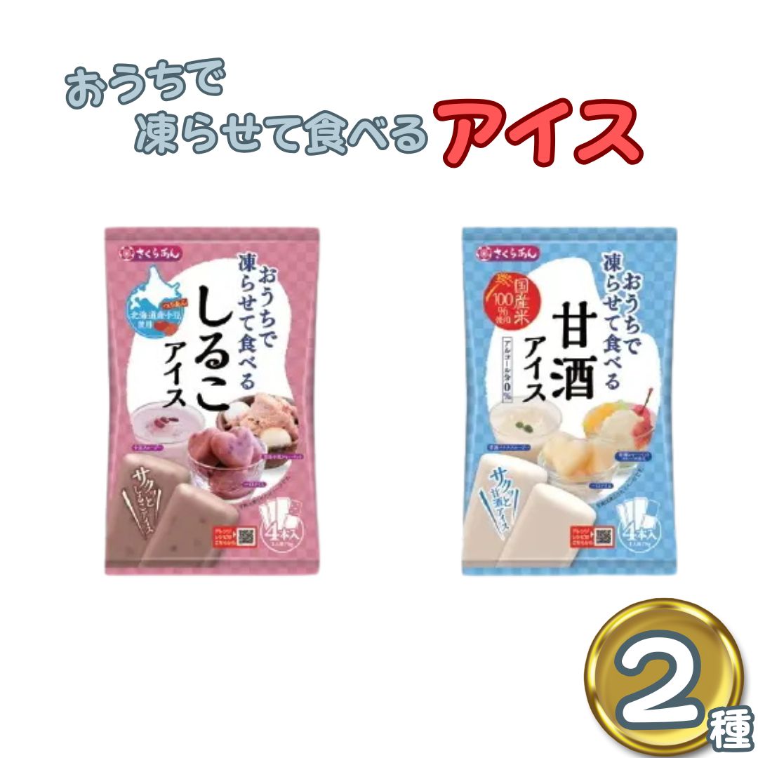 | 商品説明 | さくらあん 凍らせて食べるしるこアイス 「おうちで凍らせて食べる」の名前通り、常温保存でき自宅の冷凍庫で作れる、北海道産小豆を100%使用したしるこアイスです。 凍らせるとシャーベットの様なサクシャリ食感です。すっきりとした甘さで、小豆の粒感も楽しめます。 さくらあん 凍らせて食べる甘酒アイス 「おうちで凍らせて食べる」の名前通り、常温保存でき自宅の冷凍庫で作れる、国産米を100%使用した甘酒アイスです。アルコール分0%。 白あんを配合しているので、凍らせるとサクッとした食感です。すっきりとした甘さが楽しめます。 |