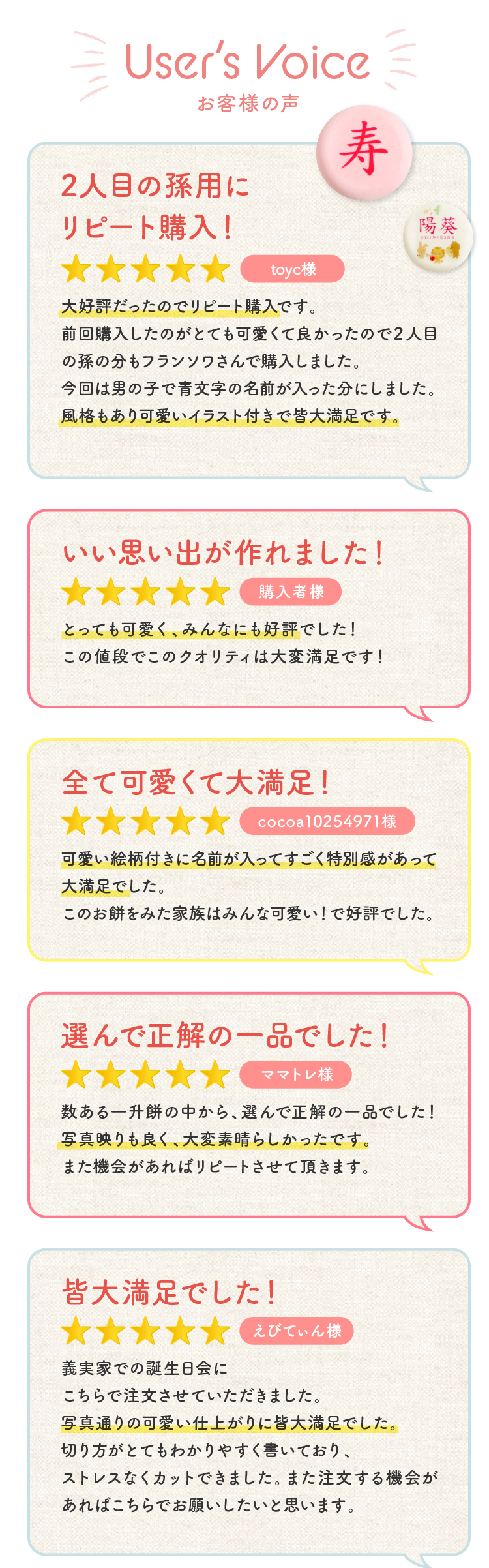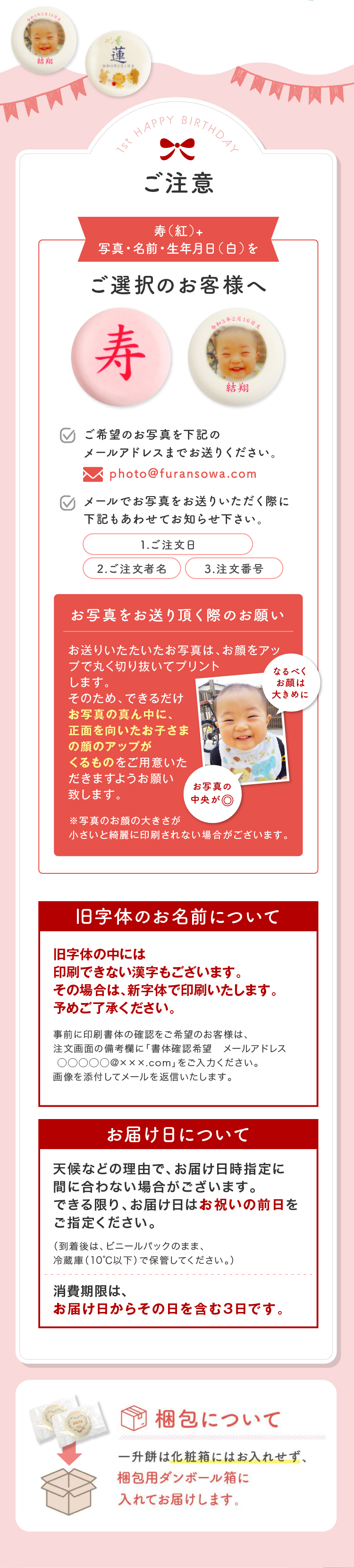 | ※旧字体の中には印刷できない漢字もございます。その場合は、新字体で印刷いたします。予めご了承ください。 ●保存方法のしおりをお付けしております。ギフトにも安心してご利用下さい。 ●熨斗(のし)の対応はお受けできません。ご了承ください。 ●メールやお電話でご連絡が取れない場合、キャンセル処理をさせていただく場合がございます。 ●お子様のお名前と生年月日は、カートに入れた後、ご注文手続き画面にて、ご入力下さい。 ●熨斗の対応はお受けできません。 【写真について】 写真は、注文後すぐにお送り下さい。 送り先→ photo@furansowa.com(注文日、注文者名、受注番号を記入して下さい)確認メールを翌営業日までに返信いたします。メールが届かない場合は、誠に恐れ入りますが、ご連絡下さい。 |