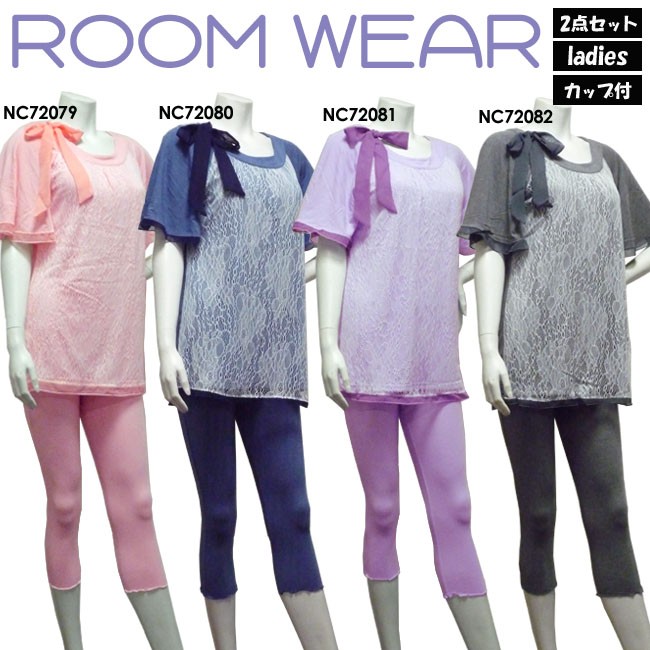 ルームウェア Chiffon 2点セット トップス(カップ付)+パンツ 前身総レース