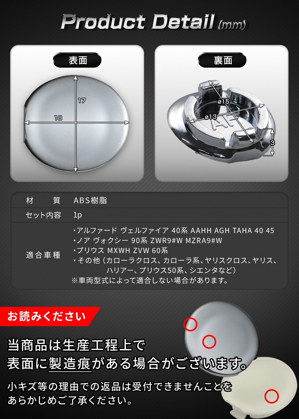 | ※車種によってボディカラーと完全に一致しない場合があります。 ※一度装着したキーホールカバーは、ツメが破損する恐れがあるため、緊急時を除き取り外しはお勧めしません。 ※緊急時は、マイナスドライバーなどを切り欠きに差し込んで取り外して下さい。 ※位置を調整する際は、ノブを引いた状態で商品を回転します。 ※弊社のドアノブカバーとは併用できません。 ※グレード・追加オプション・エアロパーツ・社外品等を装着している車によっては形状が合わない場合があります。お乗りのお車と商品画像を見比べて合うことをご確認の上、ご購入をお願いいたします。 ※車両適合情報は本製品発売時のものになります。その後の車両側の仕様変更や改修によっては正常に動作/適合しない場合がありますのでご注意ください。 ※取り付けの際の工賃等の請求は一切受け付けません。 ※お取り付けは、自己責任にて、作業を行って下さい。お客様責任による破損での対応は受付できません。 ※必ずフィッティング確認を行ってから取り付けてください。 ※社外品につき小傷等がある場合がございますが、使用に支障がない限り交換、返品はいたしません。 ※本製品を使用したことによる直接、間接的に生じた事故、損害、破損についての責任は弊社は一切負いません。 ※モニターの環境により商品の色合いや素材感などが異なる場合がございます。 ※商品は予告なく仕様変更もしくは販売終了している場合がございますのであらかじめご了承ください。 ※国外への配送はEMSでの発送です。ご注文後、弊社よりメールにて別途送料などをお知らせいたします。 |