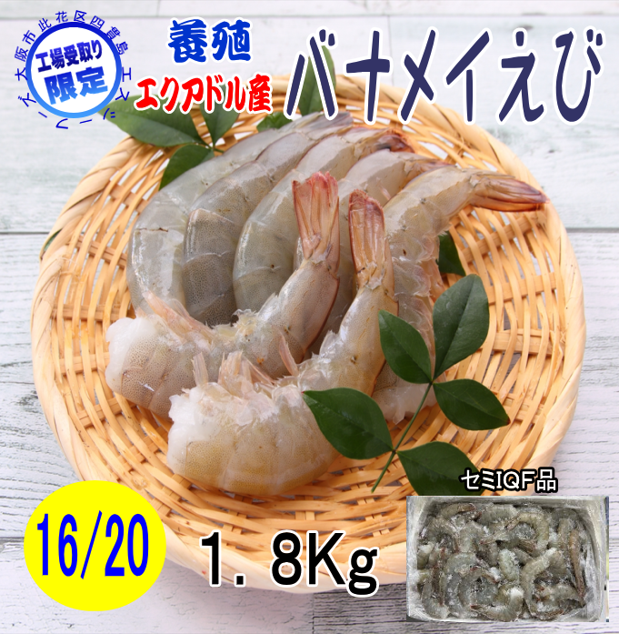 【工場受取り限定 大阪市此花区】養殖 エクアドル バナメイえび 16/20 1.8kg