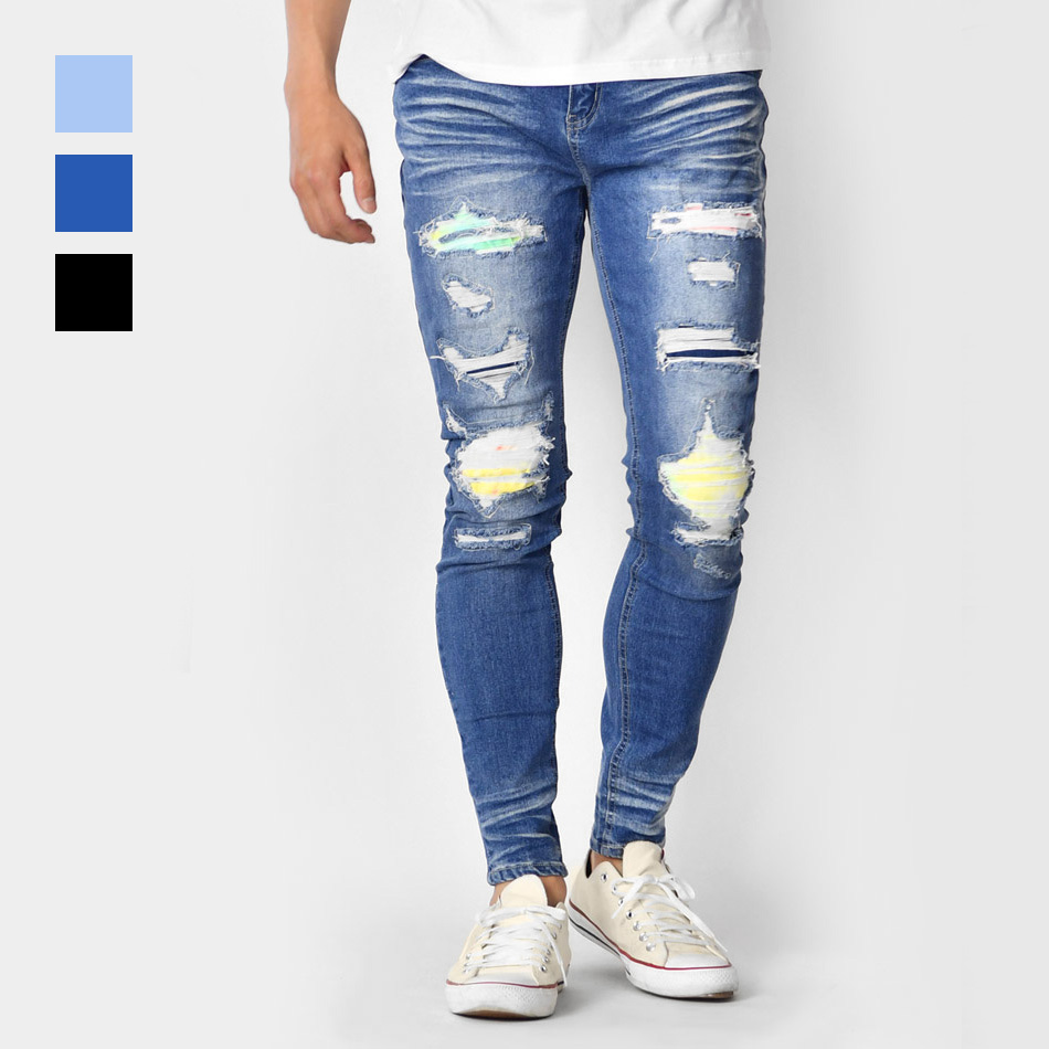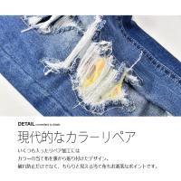 スキニー デニム ジーンズ メンズ アンクルパンツ クラッシュ加工 ユーズド加工 ストリート ビター 韓国 ブルー ストレッチ S