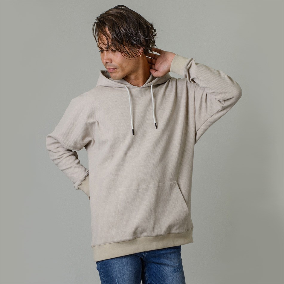 表面変化のある膨れジャガード生地を使用したビッグシルエットのプルパーカーです。