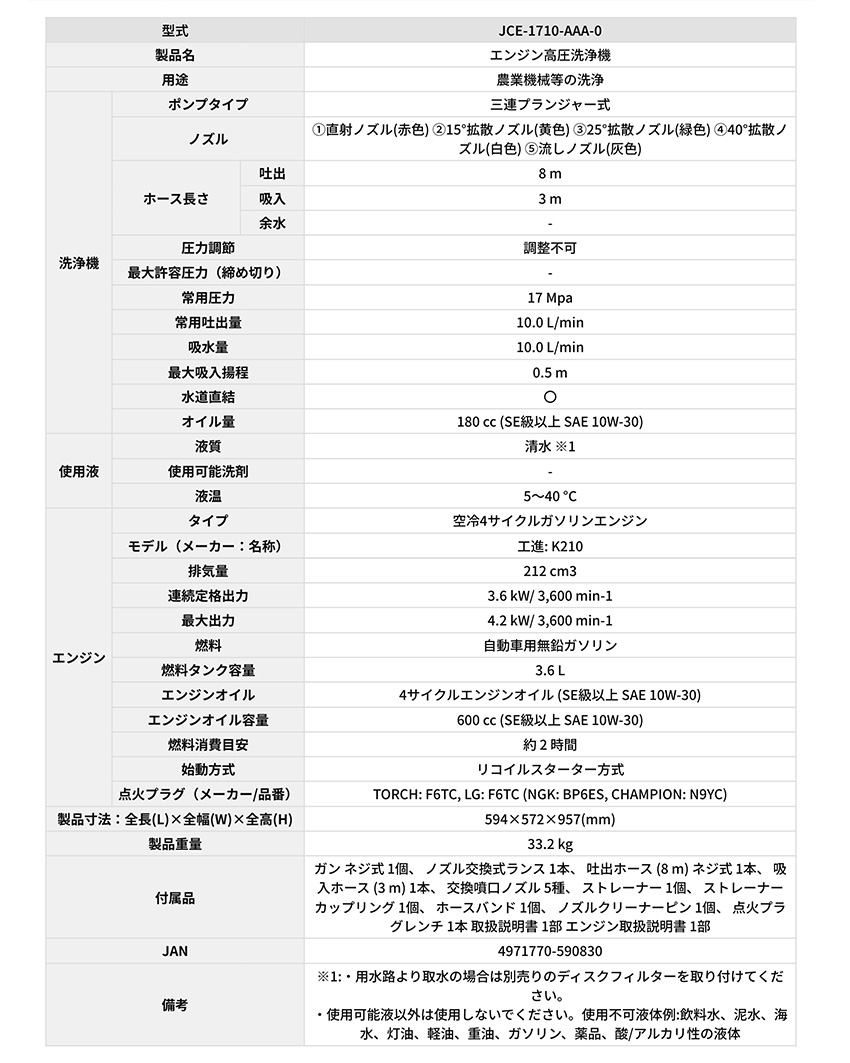 工進 高水圧 充電式 高性能 自吸タイプ 業務用 家庭用 小型 ハイパワー エンジン式 高圧洗浄機 JCE-1710 17MPa 電動 5.6馬力