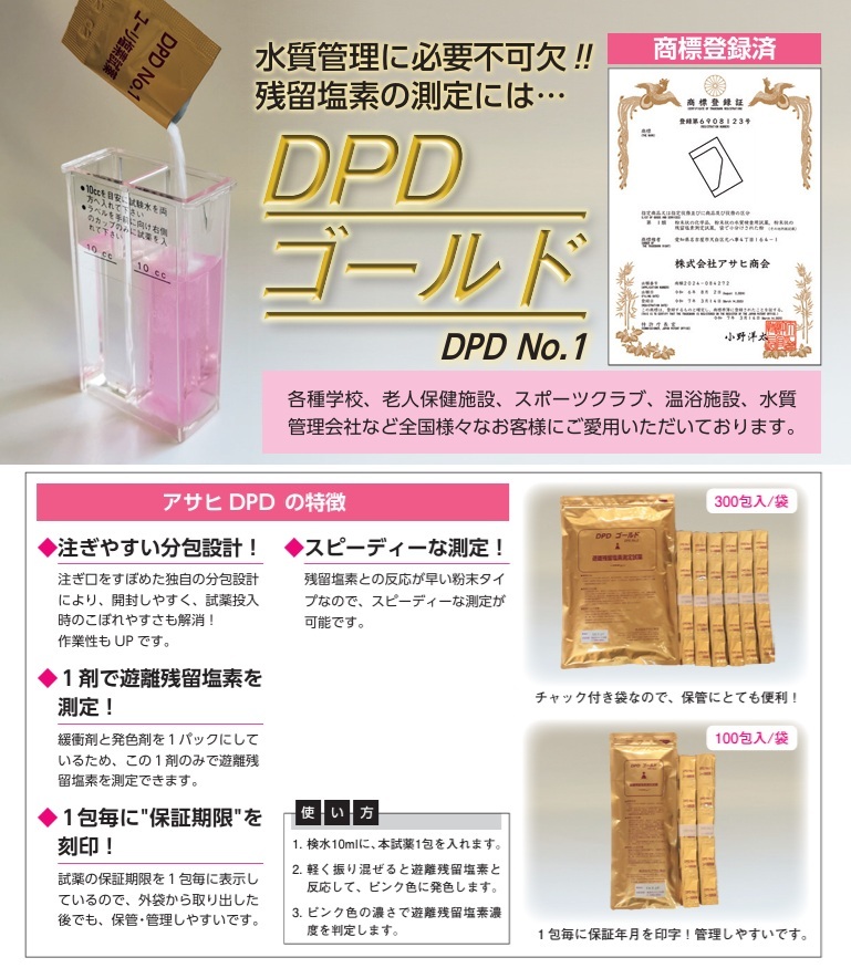 アサヒ商会 残留塩素試薬 DPDゴールド 100包 残留塩素 試薬 ユーリ塩素試薬 遊離残留塩素測定用試薬 DPD No1