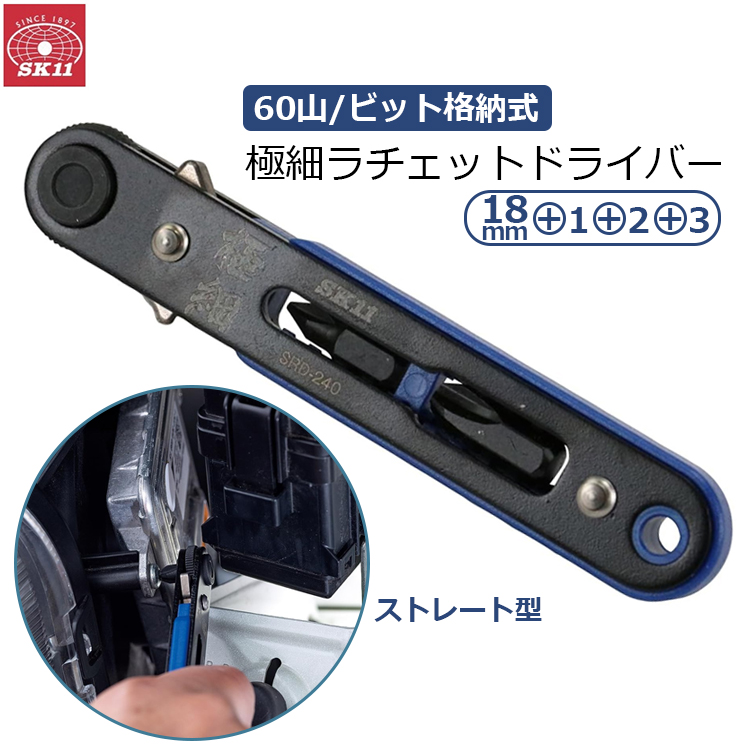 SK11 極細 ラチェットドライバー ストレート 60山 +18mm ビット格納式 コンパクト スリム 隙間 狭い場所 SRD-240
