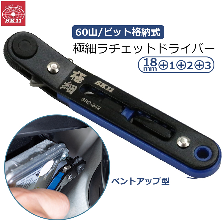 SK11 極細 ラチェットドライバー ベントアップ型 60山 +18mm ビット格納式 コンパクト スリム 隙間 狭い場所 SRD-242