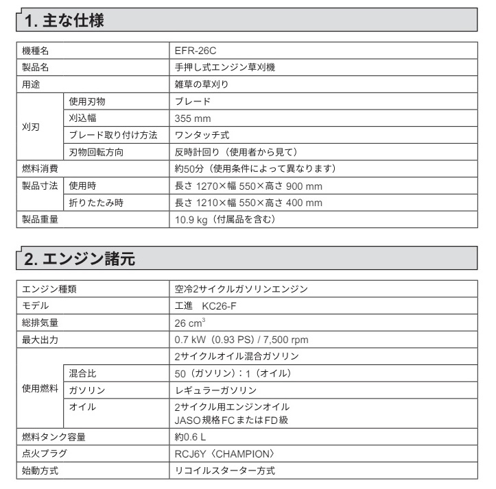 工進 草刈機 押す 草刈り機 刈払機 手押し式エンジン草刈機 2サイクル EFR-26C 排気量26cc キャリー式草刈機