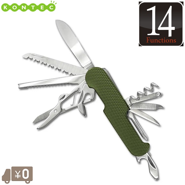 コンテック 14徳ツール グリーン KE-195 十徳ナイフ 万能ナイフ 小型ナイフ 栓抜き 缶切り コルク抜き 栓抜き ウロコ取り キャンプ用品 釣り具 マルチツール