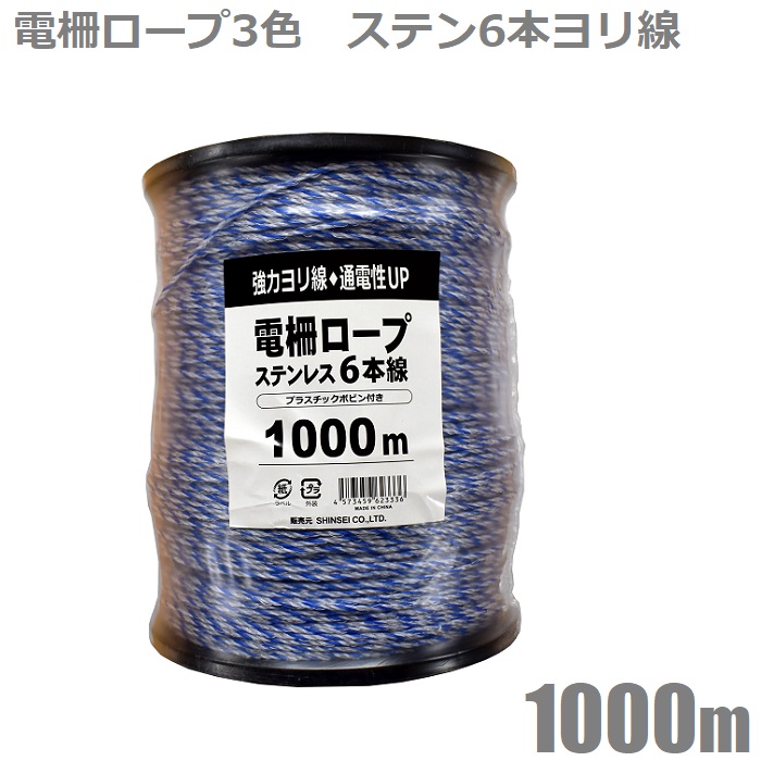 電気柵 電柵ロープ 1000m ボビン付 3色 ステンレス線6本 ヨリ線 電柵線 電線 電柵支柱 猪 電柵資材 撚り線 青色 ブルー