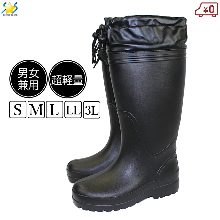 シンセイ 長靴 軽量 超軽量 長ぐつ ブラック 黒 レインブーツ ガーデニングブーツ アウトドア メンズ レディース 男性 女性 S/M/L/LL/3L フード付き 園芸 雨 雪