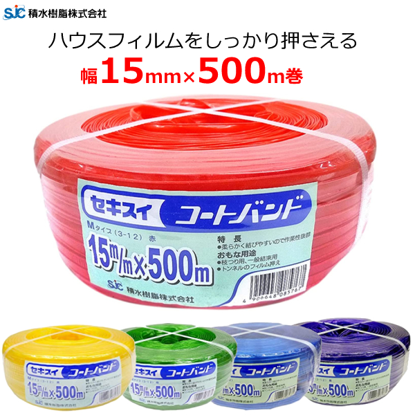 ハウスバンド コートバンド 15mm×500m巻 赤 青 黄 緑 紫 強風 防風 台風対策 フィルム押さえ カラータイプ セキスイ