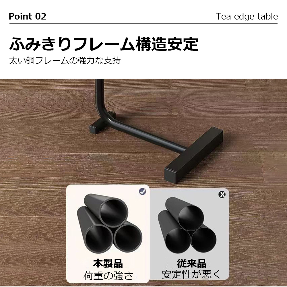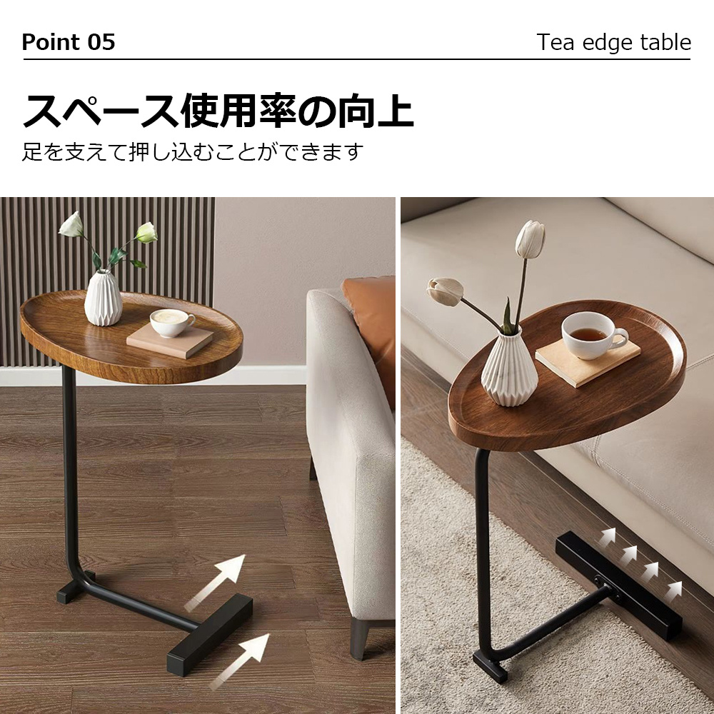 天板の角が丸く加工されているので、角をが痛くて使いにくいといった心配はありません。ソファに差し込めるから、座りながらのティータイムも快適に過ごせる。ソファやベッド、テーブルの傍らに。いつもそばに置いておきたい、様々なシーンで役立つサイドテーブル。
