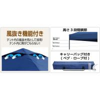 商品名:ワンタッチテントST300 /品番:FTSS300 /サイズ 本体(約):幅300x奥行300cm 収納時(約):幅20x奥行20x高さ120cm(付属品除く) 重量(約):14.6kg 高さ調節3段階(約):軒下高174/154/124cm フレーム(脚):25mm角/20mm角x板厚0.7mm フレーム(その他):10x20x板厚0.6mm /仕様 材質: フレーム:スチール 生地:ポリエステル、150Dオックスフォード生地、PUコーティング、シームテープ加工、UVカット率99%以上、耐水圧800mm /カラー ネイビー /備考 付属品:キャリーバッグ・ペグ8本・ロープ4本 /注意点 ※製品の仕様は予告なく変更することがあります。 ※ご使用に問題のない範囲の縫製・仕立ての甘さ、製造工程によるキズ、ヘコミ等は不良対象外となりますので予めご了承ください。 ※北海道・沖縄・離島・一部地域は配送不可。