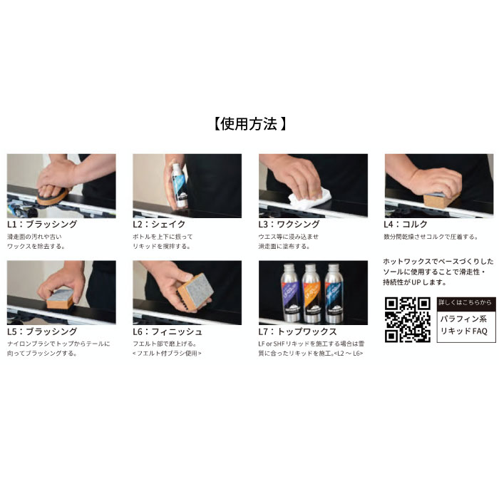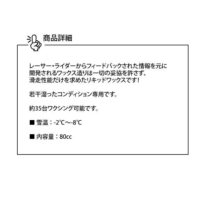 固形ワックス(アイロン用)NFシリーズ、SHFシリーズ、RMUをリキッド化した次世代ワックス。塗ってブラッシングするだけの簡単ワクシングでプロから初心者まで仕上がりは同じ。LF LQDは若干湿ったコンディション専用です。【商品詳細】○雪温 : -2℃〜-8℃○内容量 : 80cc(約35台ワクシング可能)