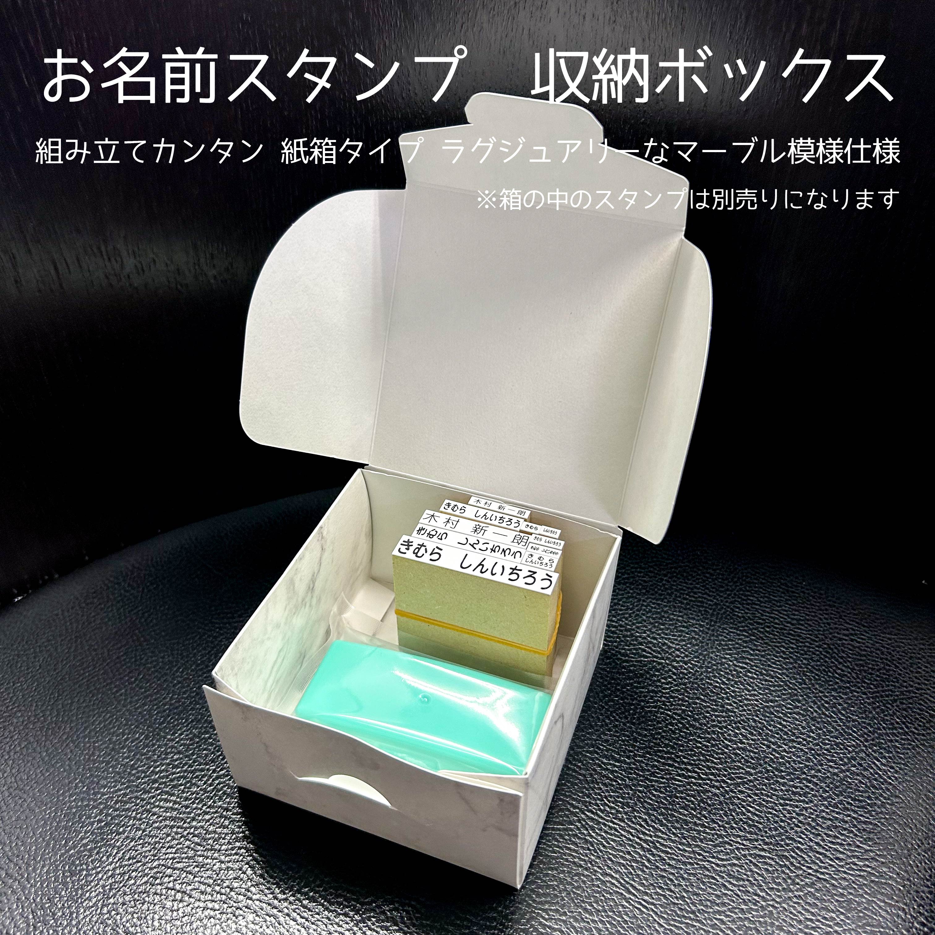 お名前スタンプ 収納ボックス 組み立てカンタン 紙箱タイプ ポスト投函 ラクジュアリーなマーブル模様使用当店でご購入頂きました全ての種類のお名前スタンプセットがこちらのケースに収まります。※こちらの商品に取り扱い説明書は同封されませんので、組み立て方法につきましては、・商品画像または・商品動画をご確認下さい。紙箱のサイズ・外寸 奥行き約10.8cm・内寸 奥行き約10.2cm ・外寸 横幅 約10.4cm・内寸 横幅 約9.7cm ・外寸 高さ約6.4cm・内寸 高さ約6cm