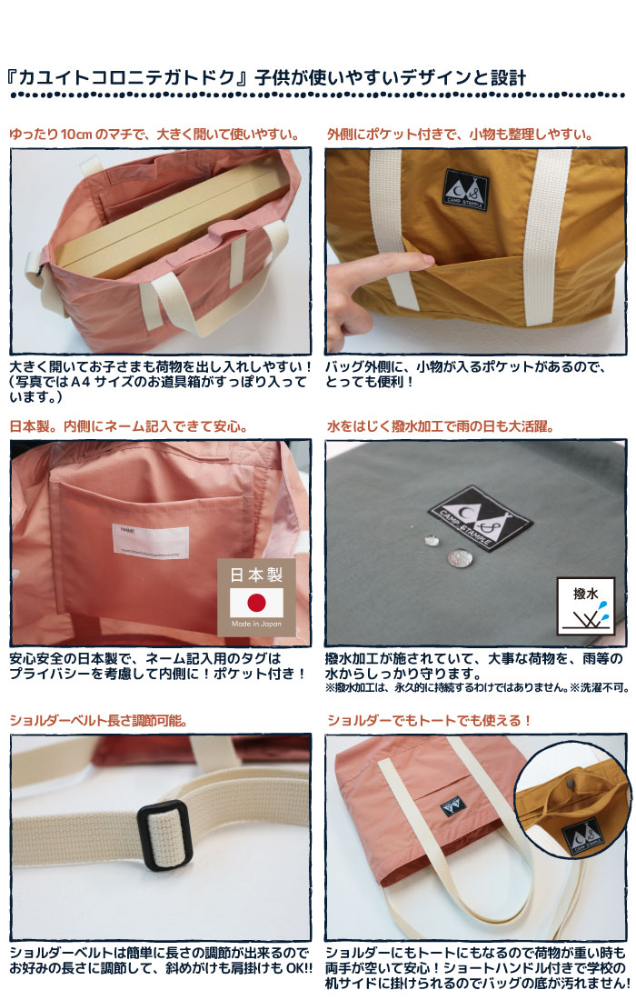 10cmのゆったりマチ付きで、A4ファイルもお道具箱も入って様々なシーンで大活躍します!