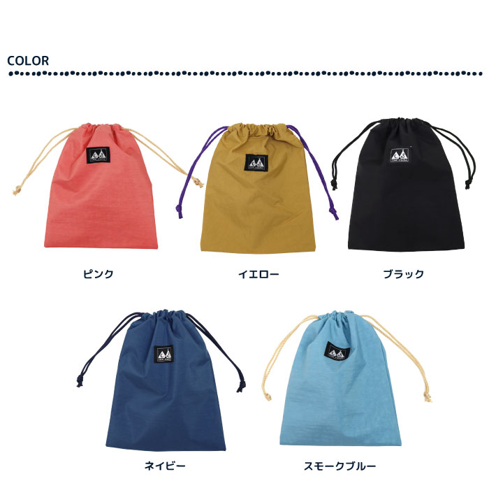 カラーはピンク・イエロー・ブラック・ネイビー・スモークブルーの5色。別売りでМサイズとLサイズの巾着や、お揃いのランチマット(品番 63009)も販売中です。