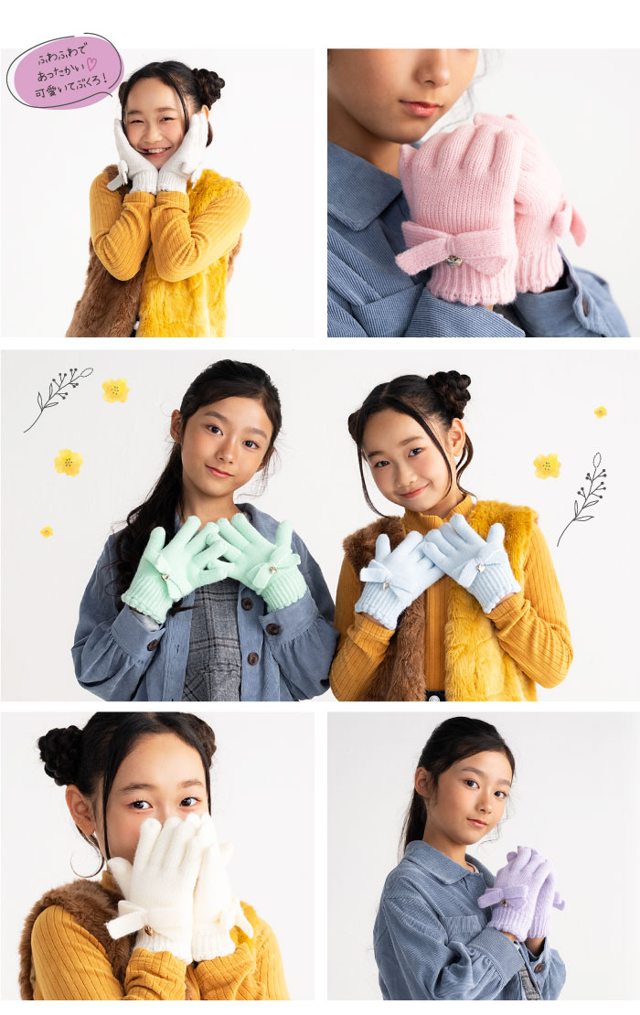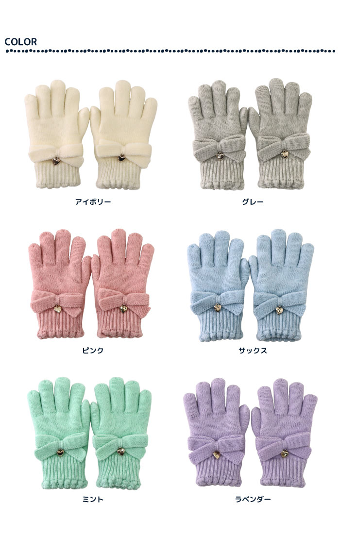 stample スタンプル リボンニットグローブ キッズ 子供 手袋 暖かい 冬 リボン ハート ラメ チャーム付き ボア 5本指 てぶくろ