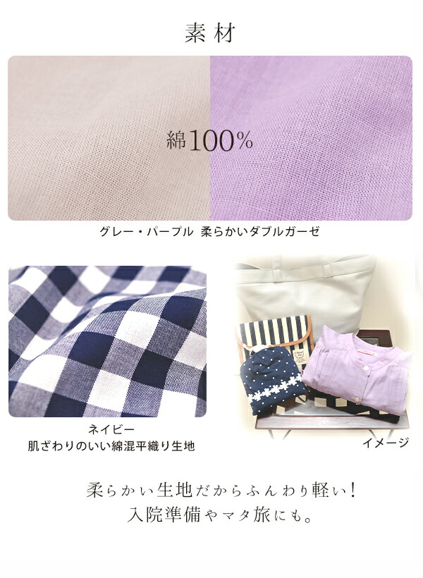 | 無地(ベージュ、パープル):綿100% ギンガムチェック(ネイビー) : ポリエステル65% 綿35% |