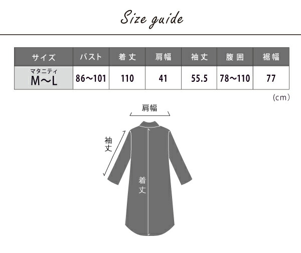| 【マタニティM〜L】 バスト(86〜101)cm 腹囲(78〜110)cm 身丈110cm 袖丈55.5cm ()内は基本身体寸法です。 |